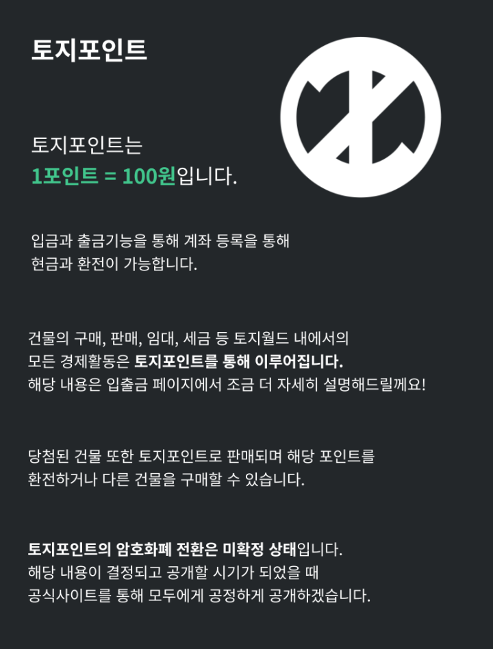 - 건물의 구매, 판매, 임대, 세금 등 토지월드 내에서의 모든 곙제활동은 토지포인트를 통해 이루어진다.