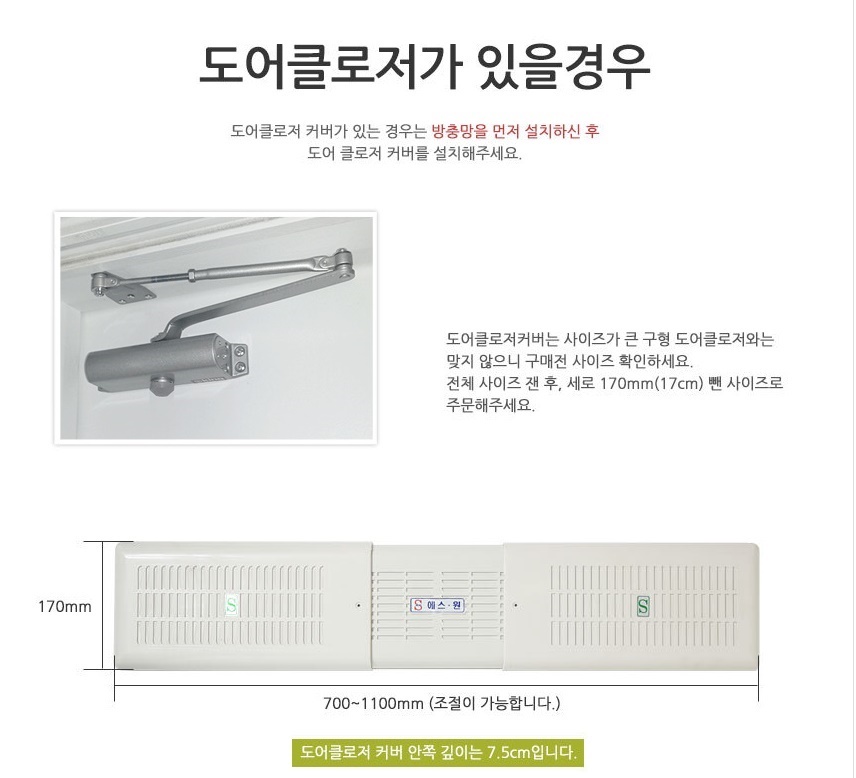 - 현관문에 도어 클로저가 있는 경우에는 방충망을 먼저 설치하고 도어클로저 커버를 설치한다.