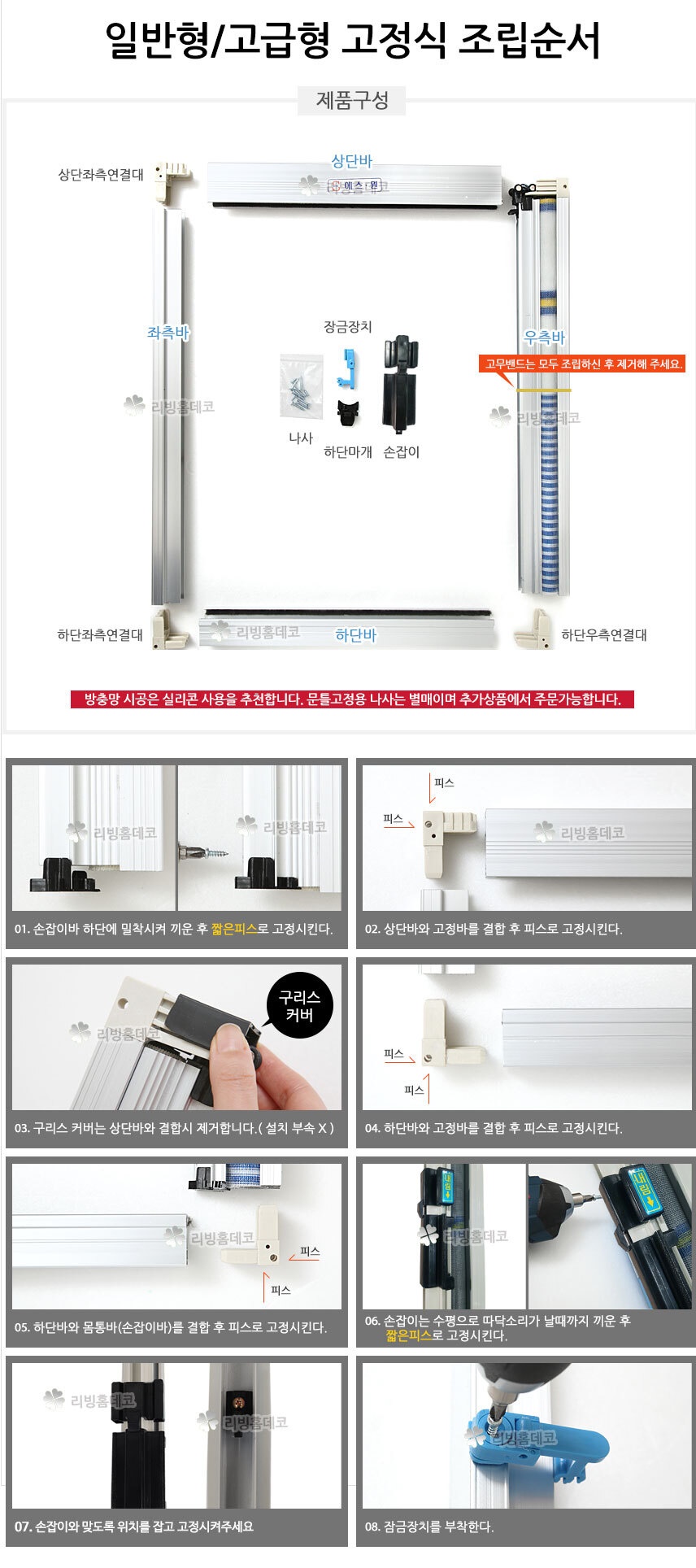 - 자동롤 방충문 세트(상단바, 좌측바, 우측바, 하단바, 연결대x3, 손잡이, 하단마개, 잠금장치, 나사)