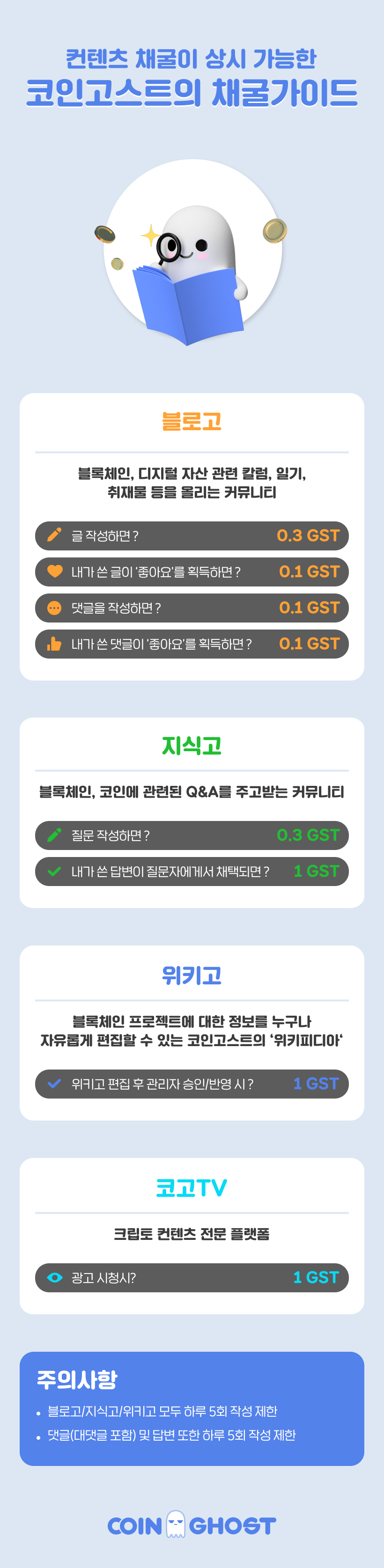 GST 채굴방법도 다양해져서 블로고, 지식고, 위키고, 클린 코고 지킴이 등을 이용하면 GST가 지급된다. 현재 코인고스트(COINGHOST)는 MEXC, LBANK, XT.COM에 상장되어 거래중이다.