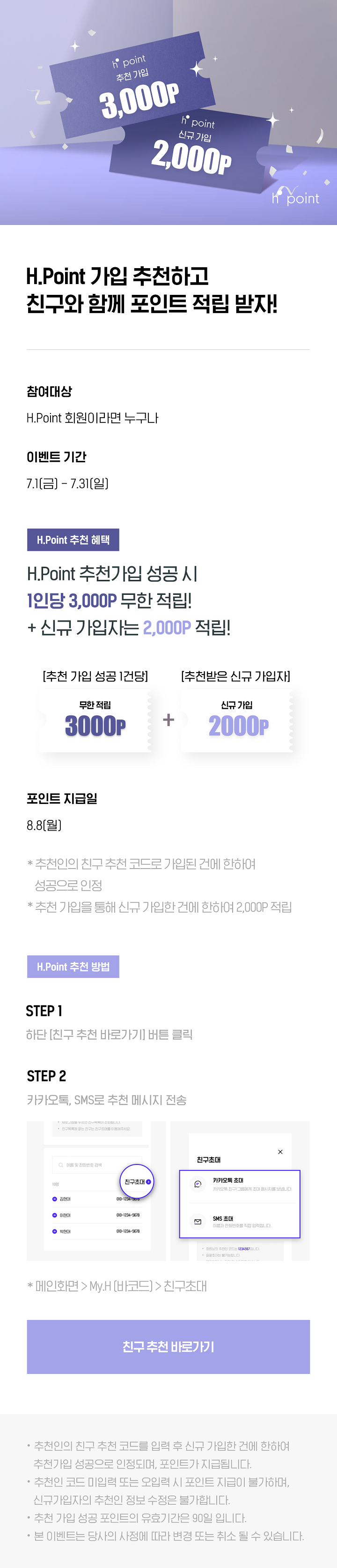 - H.Point 추천가입 성공 시 1인당 3000P 무한 적립! + 신규 가입자는 2000P 적립!