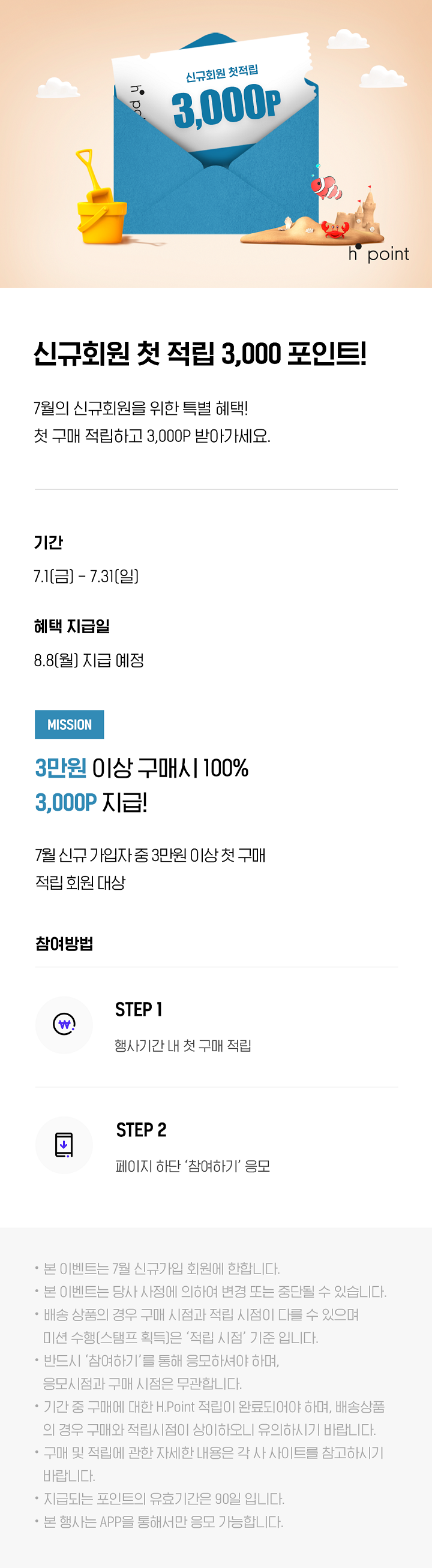* 7월 신규 가입자 중 3만원 이상 첫 구매 적립 회원 대상
