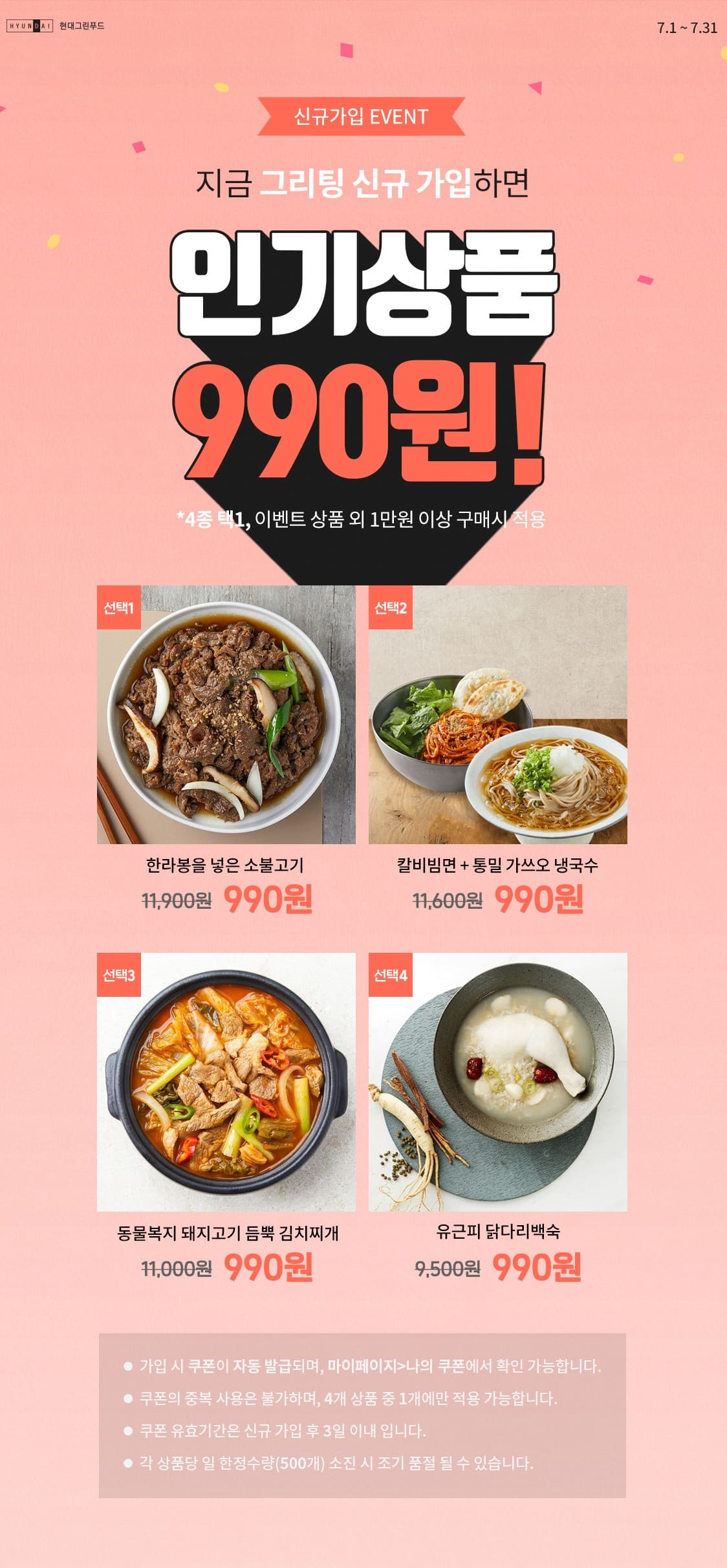 현재 그리팅몰에서 신규 회원가입 이벤트를 진행중이다. 신규로 가입한 회원에게는 10만원 쿠폰팩이 지급되고, SMS수신동의(1000P), 이메일 수신동의(1000P), 건강정보 수신동의(1000P) 선택하면 3000스푼(포인트)이 적립된다. 또 신규회원은 인기상품 4종(한라봉을 넣은 소불고기, 칼비빔면+통밀 가쓰오 냉국수, 동물복지 돼지고기 듬뿍 김치찌개, 유근피 닭다리백숙) 중 1가지를 990원에 구입할 수 있다.