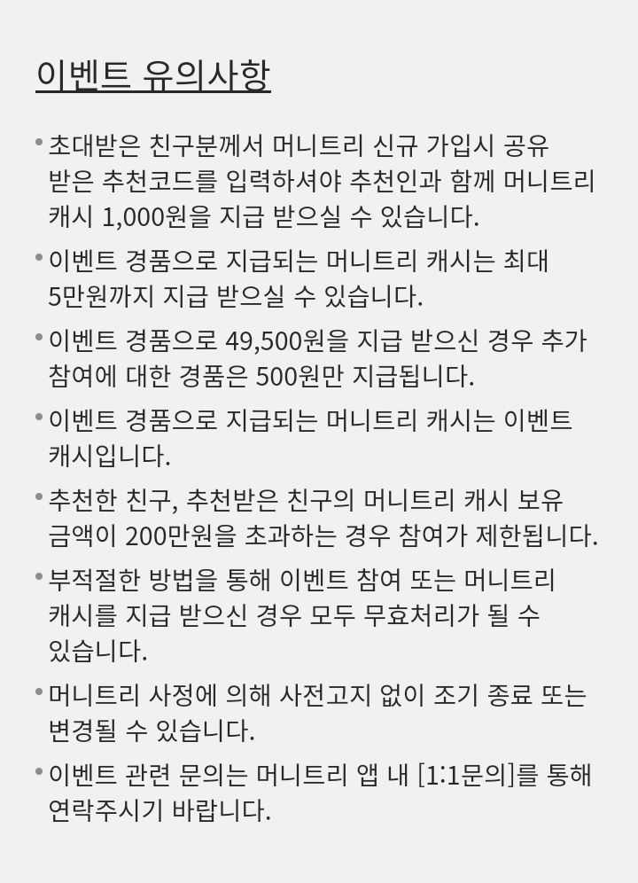 - 친구초대 이벤트는 초대받은 친구가 머니트리 신규가입 시 공유받은 추천코드를 입력해야 친구와 함께 머니트리 캐시 500원X2을 지급 받을 수 있다.