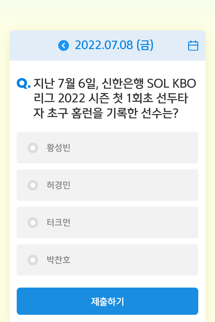 신한쏠, 야구상식 쏠퀴즈(22.07.08), 퀴즈정답, 2022 시즌 첫 1회초 선두타자 초구 홈런