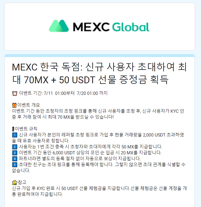 ⏰ 이벤트 기간: 7/11 01:00부터 7/20 01:00 까지 🎁이벤트 개요 이벤트 기간 동안 초청자의 초청 링크를 통해 신규 사용자를 초청 후, 신규 사용자가 KYC 인증 후 거래 참여 시 최대 70 MX을 받으실 수