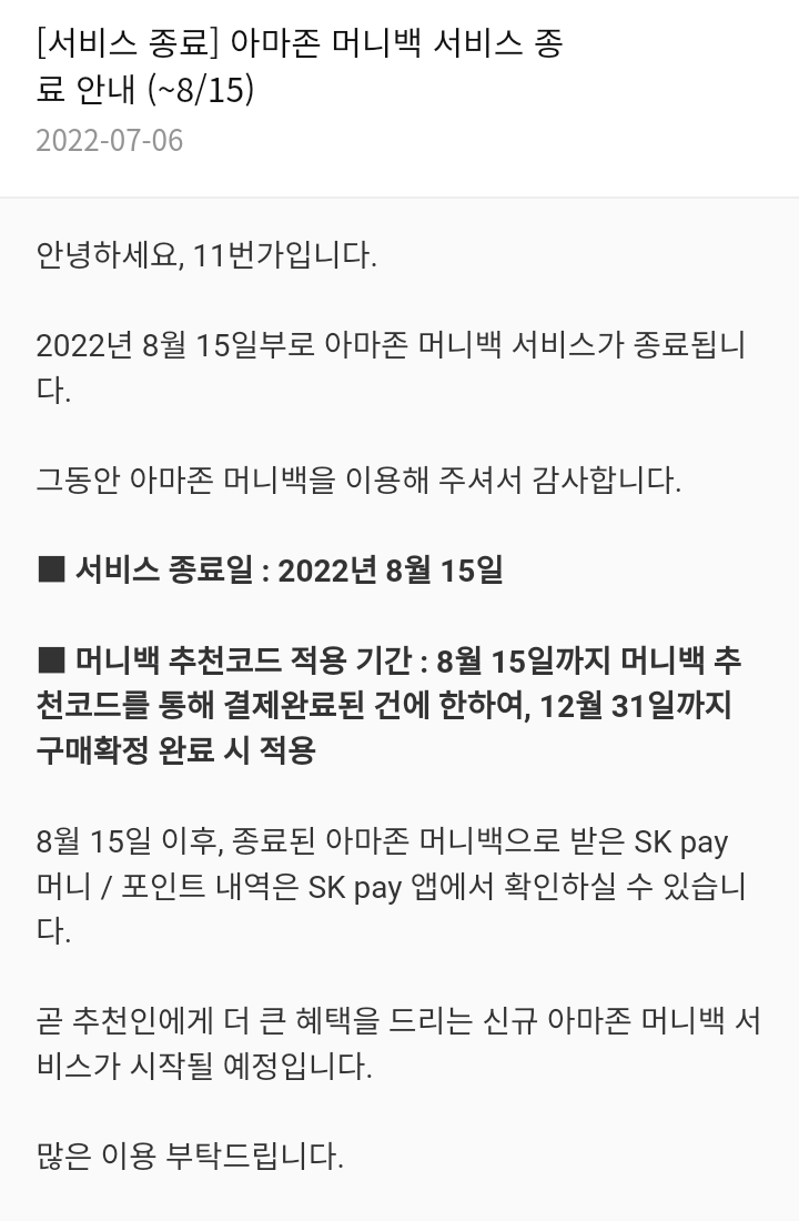 11번가 아마존 머니백 서비스 종료