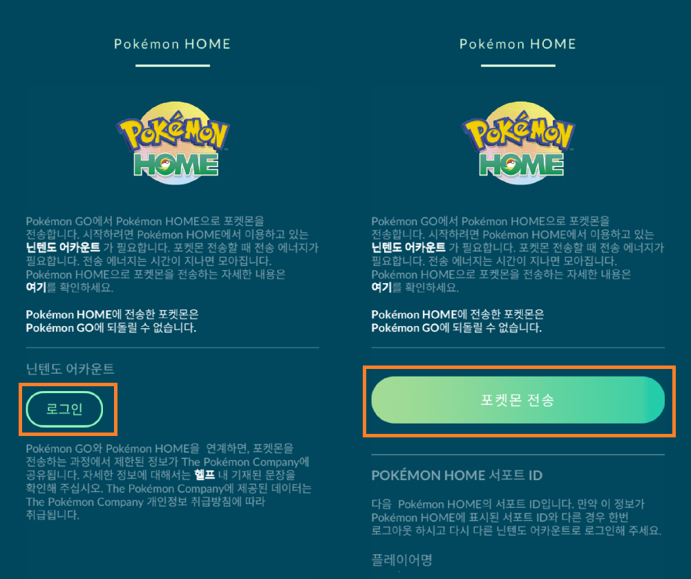 - 설정 > 포켓몬 홈 > 닌텐도 어카운트 로그인 > 포켓몬 전송