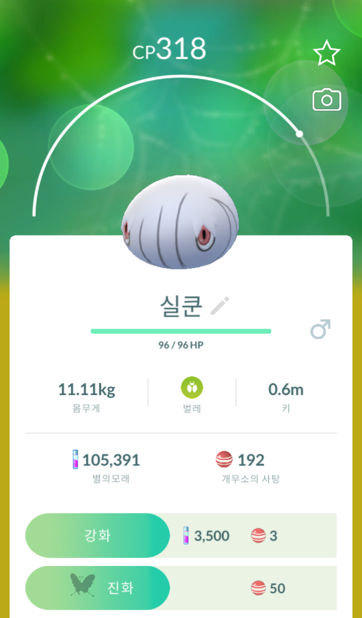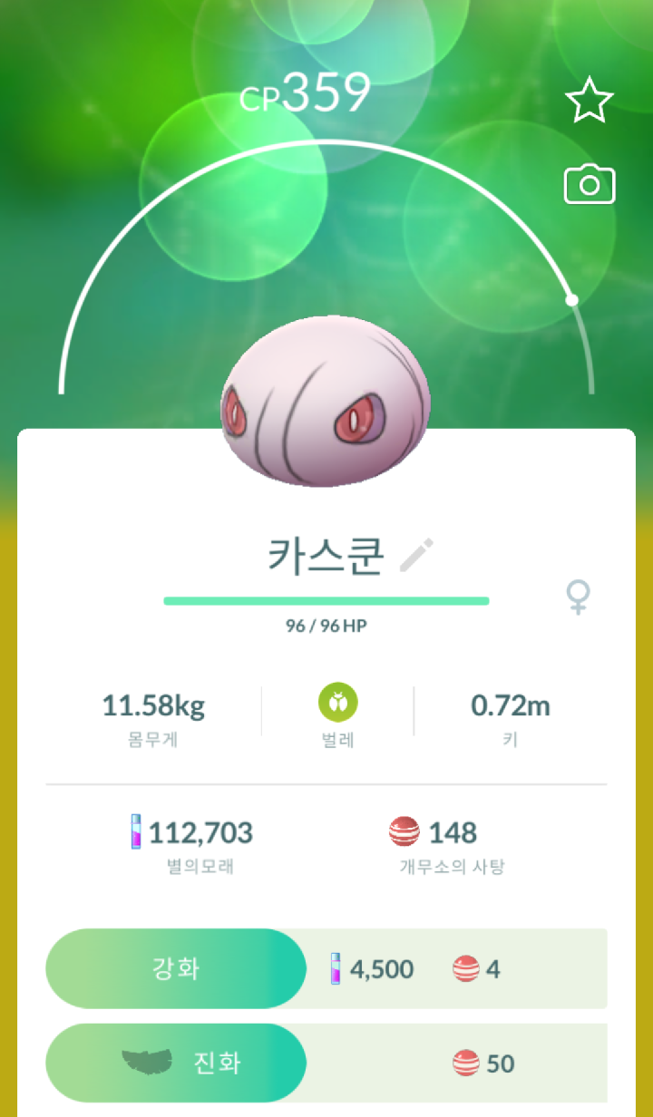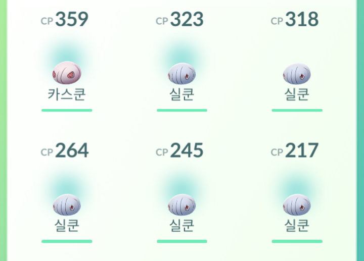 개무소 6마리를 낮, 밤 시간대를 달리해서 진화 해보았다. 6마리중 1마리만 카스쿤으로 진화했고, 나모지는 모두 실쿤으로 진화했다.