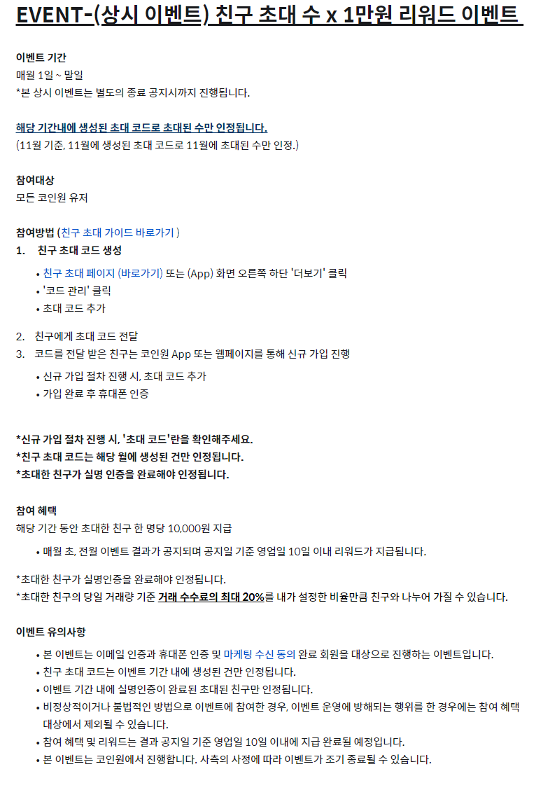 = 해당 기간 동안 초대한 친구 한 명당 10,000원 지급, 매월 초 전월 이벤트 결과가 공지되며 공지일 기준 영업일 10일 이내 리워드가 지급.