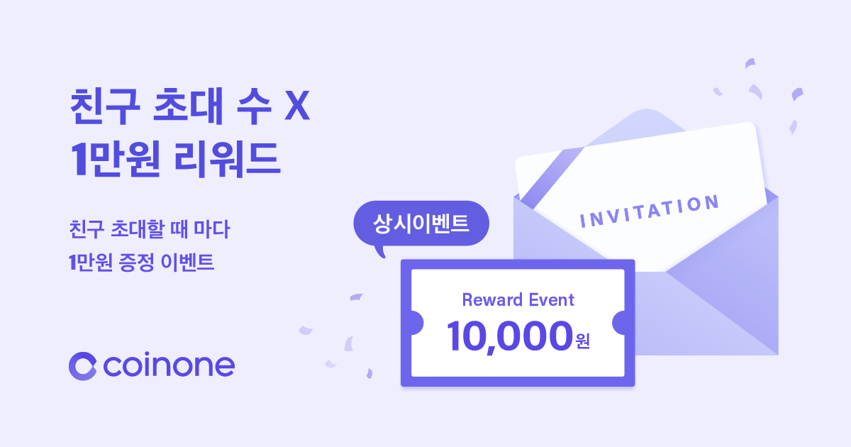 코인원(Coinone) 거래소에서 비트코인, 이더리움, 페이코인 등의 다양한 가상자산을 안전하고 편리하게 거래할 수 있다. 그리고 신규 가입 회원 2만원 증정, 친구 초대 수 x 1만원 리워드 지급 등의 상시 이벤트가 진행중이다.