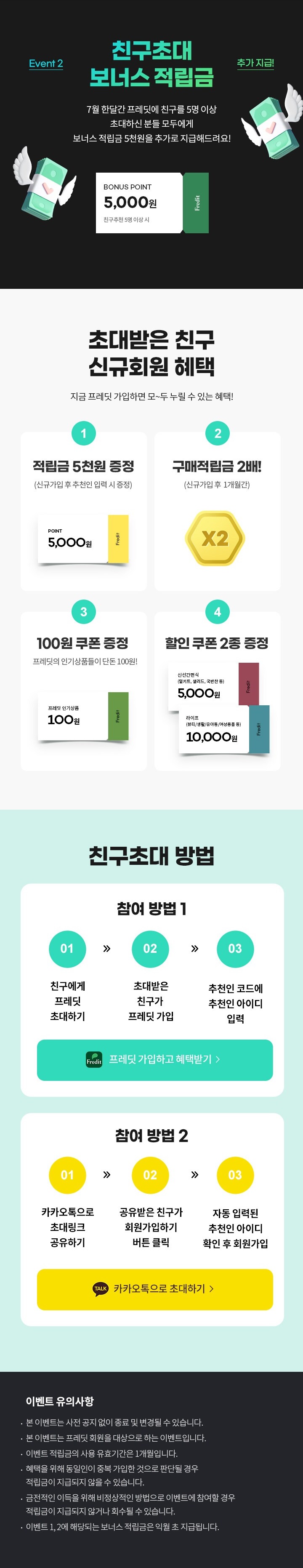 - 회원가입 시 친구추천 아이디를 입력하면 본인과 친구에게 모두 프레딧 5천원 적립금 지급