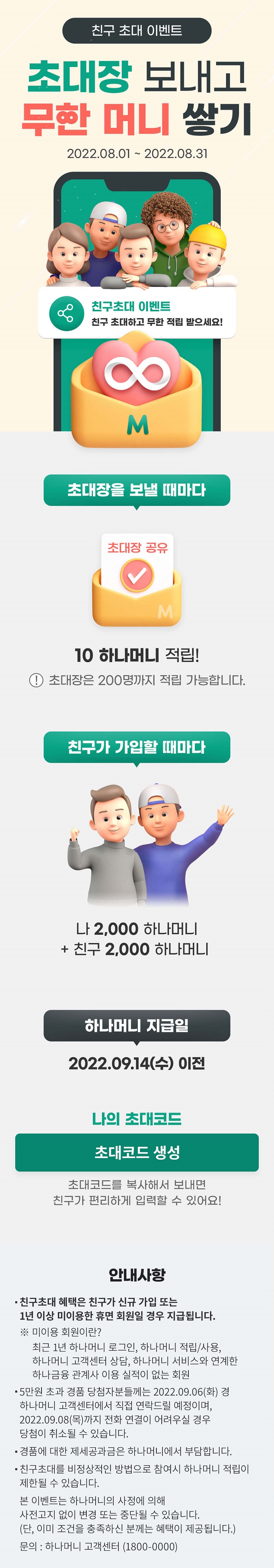 - 친구초대를 비정상적인 방법으로 참여시 하나머니 적립이 제한될 수 있다.
