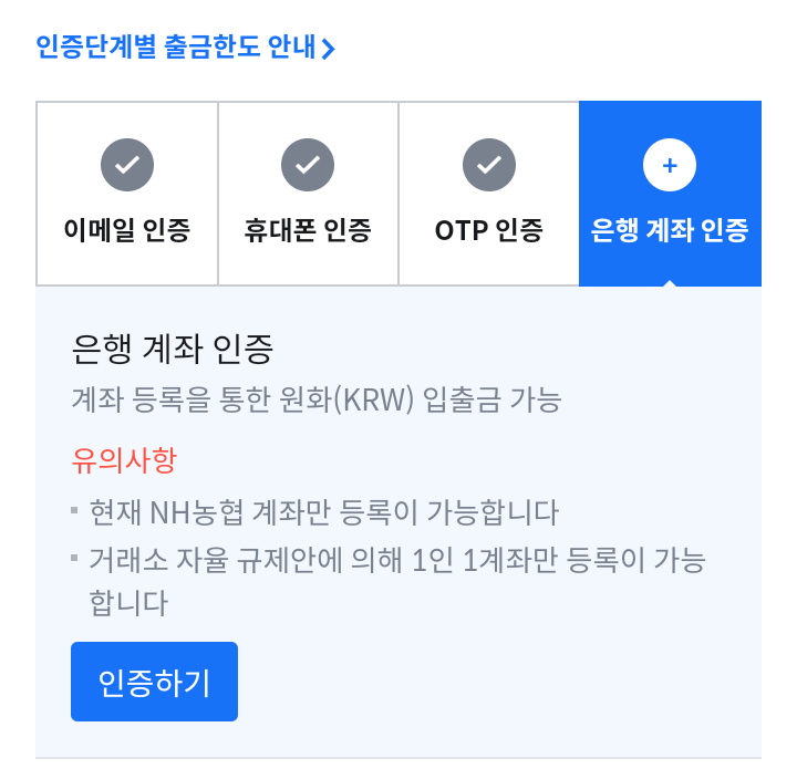 - 다른 가상자산 거래소와 같이 이메일, 휴대폰, OTP, 계좌 인증을 거쳐야 한다. 원화 및 코인 입출금을 위해서는 은행계좌 인증을 해야 한다.