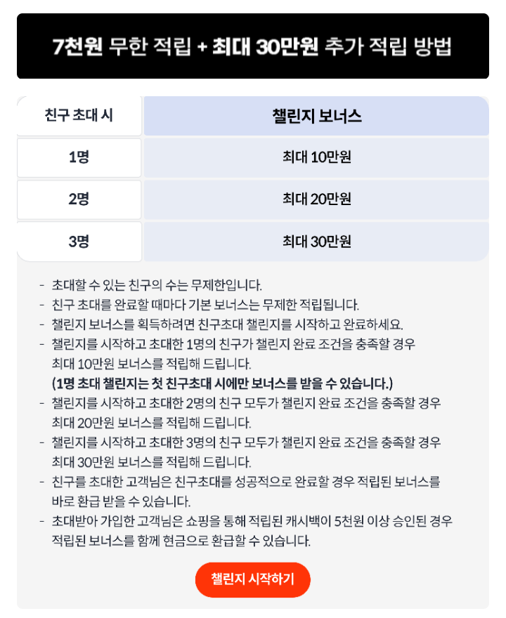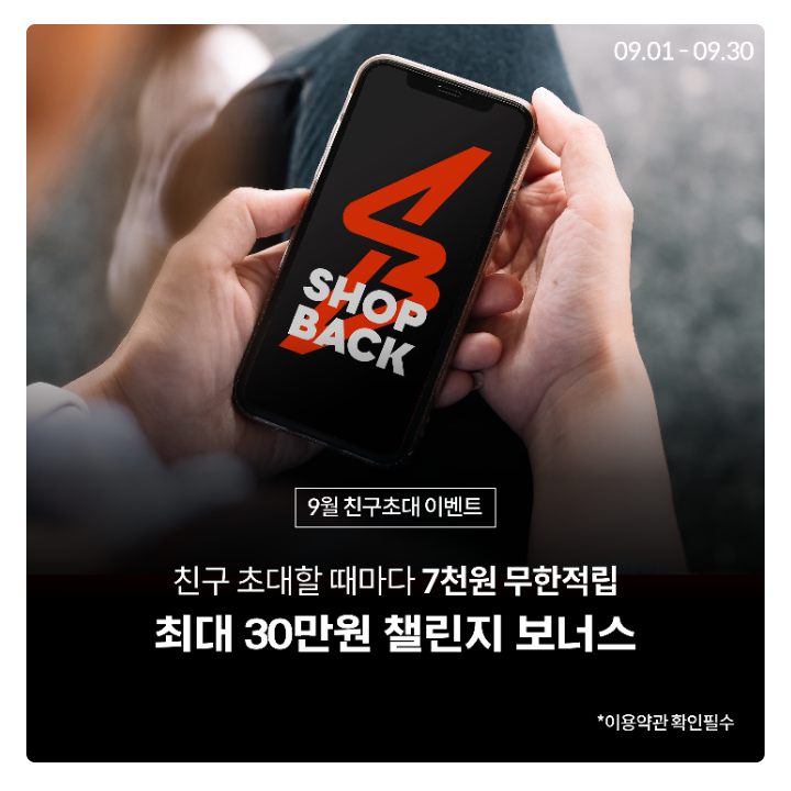 샵백(SHOPBACK) 코리아에서 9월 친구초대 이벤트를 진행하고 있다. 추천링크를 통해 샵백에 가입하면 7천원 보너스가 적립되고, 최대 30만원 추가 챌린지 보너스가 적립된다.