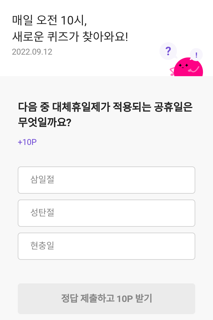 리브메이트 오늘의 퀴즈(22.09.12), 퀴즈정답, 대체휴일제가 적용되는 공휴일