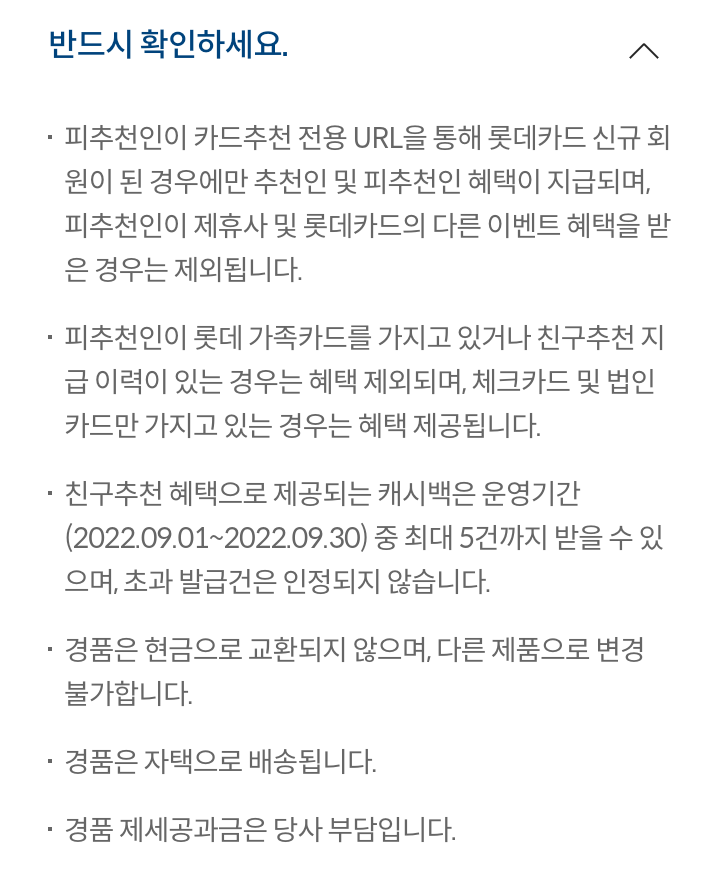 - 피추천인이 롯데 가족카드를 가지고 있거나 친구추천 지급 이력이 있는 경우는 혜택 제외되며, 체크카드 및 법인카드만 가지고 있는 경우는 혜택 제공된다.