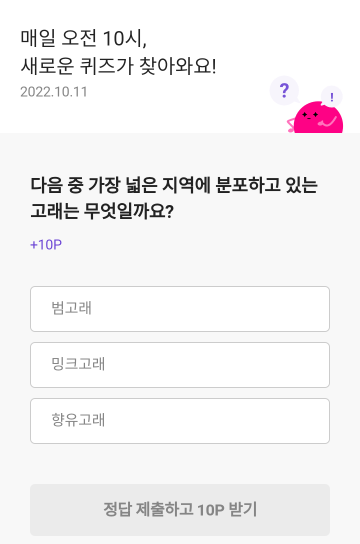 리브메이트 오늘의 퀴즈는 매일 오전 10시에 새롭게 찾아갑니다. 퀴즈 풀고 포인트 받아가세요.