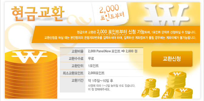 - 현금 교환은 2000 포인트부터 신청할 수 있고, 1포인트 단위로 신청할 수 있다.(1P=1원)