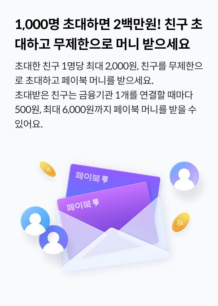 - 초대한 친구 1명당 최대 2,000원, 친구를 무제한으로 초대하고 페이북 머니를 받으세요.