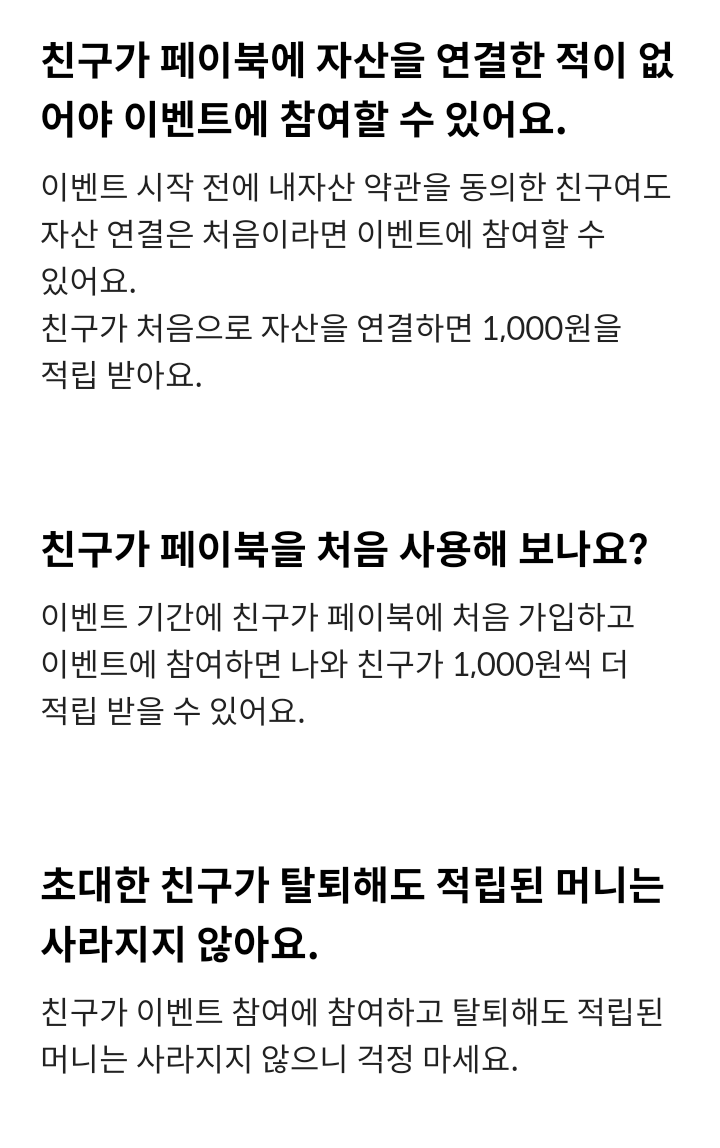 3) 친구가 페이북에 자산을 연결한 적이 없어야 이벤트에 참여할 수 있다.