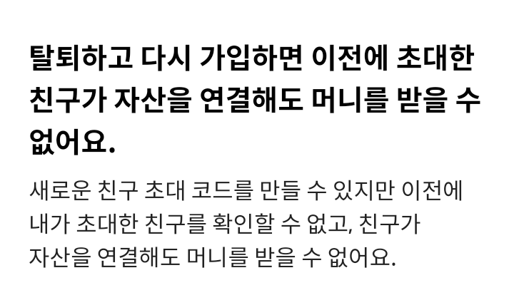 6) 탈퇴하고 다시 가입하면 이젠 초대한 친구가 자산을 연결해도 머니를 받을 수 없다.