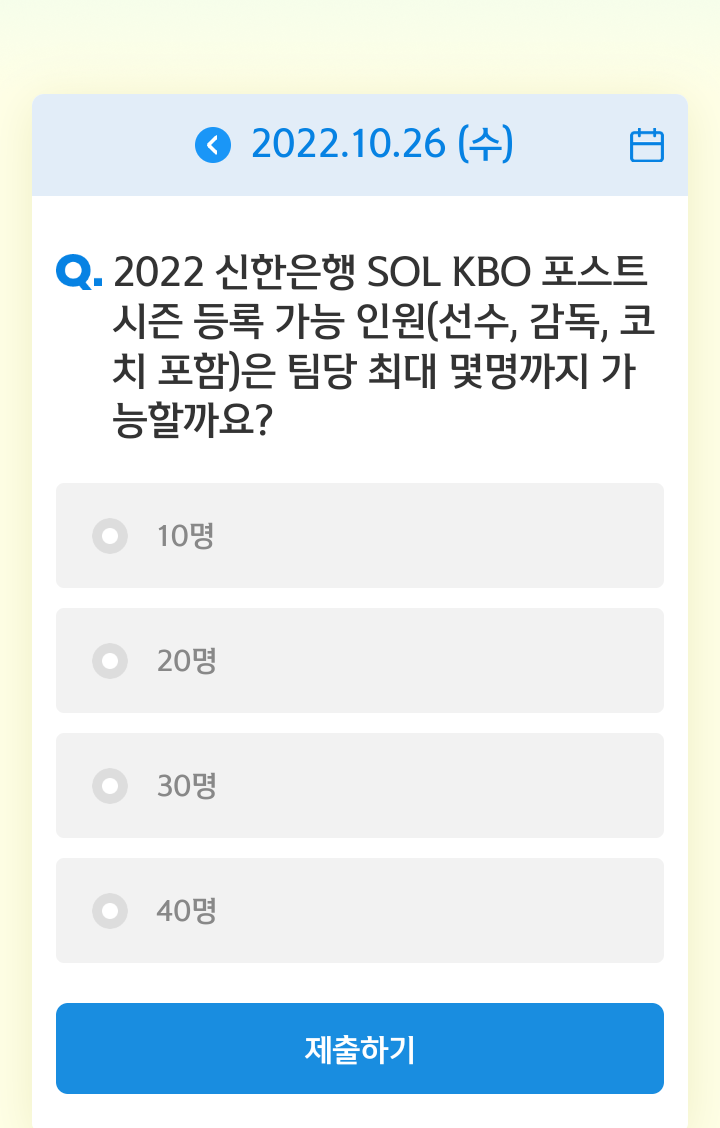 신한쏠, 야구상식 쏠퀴즈(22.10.26), 퀴즈정답, 포스트 시즌 등록 가능 인원