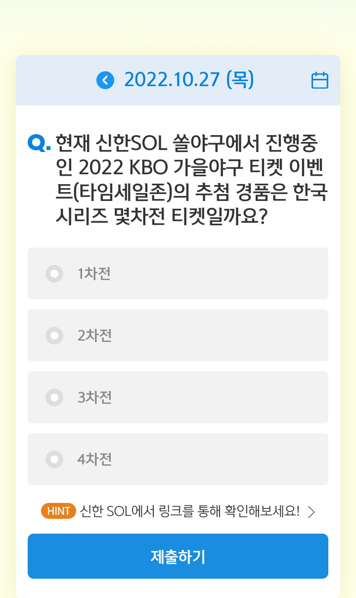 신한쏠, 야구상식 쏠퀴즈(22.10.27), 퀴즈정답, KBO 가을야구 티켓 이벤트