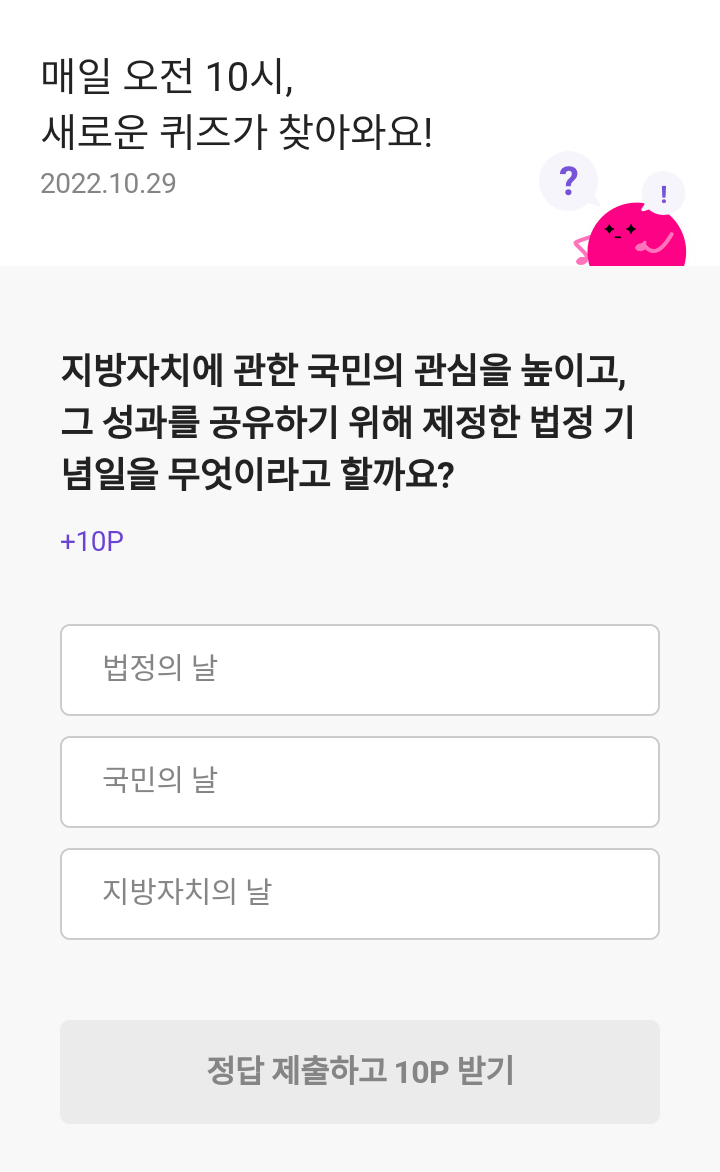 리브메이트 오늘의 퀴즈(22.10.29), 퀴즈정답, 지방자치에 관한 국민의 관심을 높이고