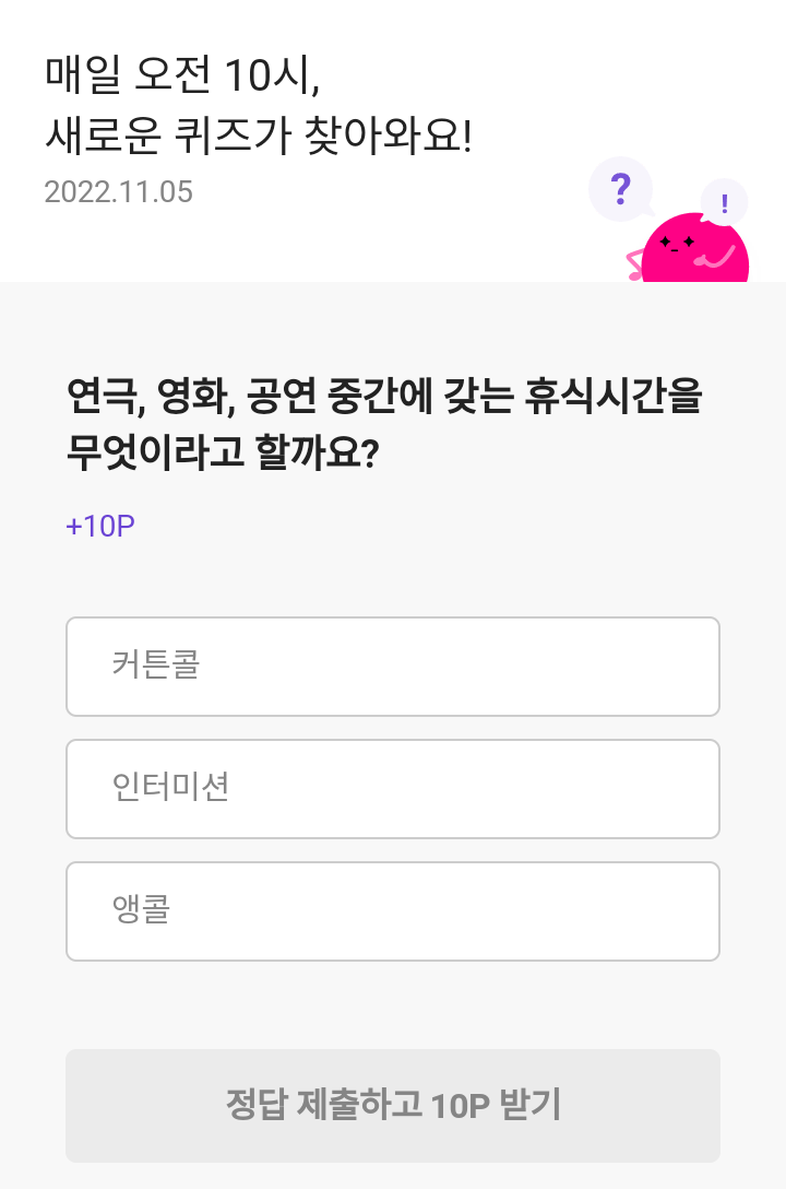 리브메이트 오늘의 퀴즈(22.11.05), 퀴즈정답, 연극, 영화, 공연 중간에 갖는 휴식시간