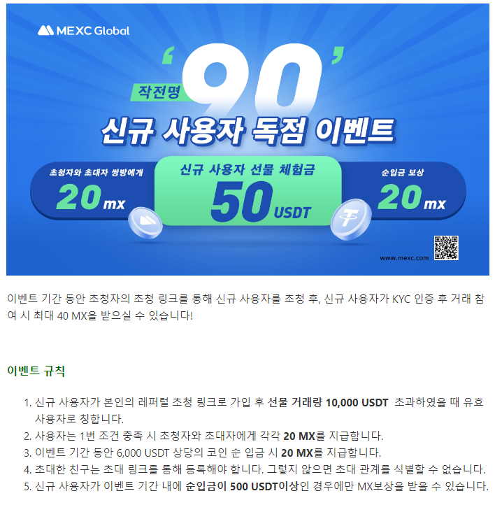 ▣ MEXC 작전명 '90' - MEXC 신규 사용자 초대 이벤트: 최대 40MX+ 50 USDT