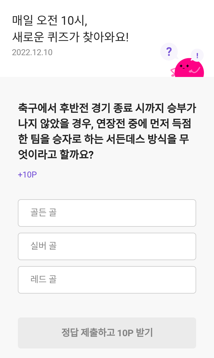 리브메이트 오늘의 퀴즈(22.12.10), 퀴즈정답, 연장전 중에 먼저 득점한 팀을 승자로 하는