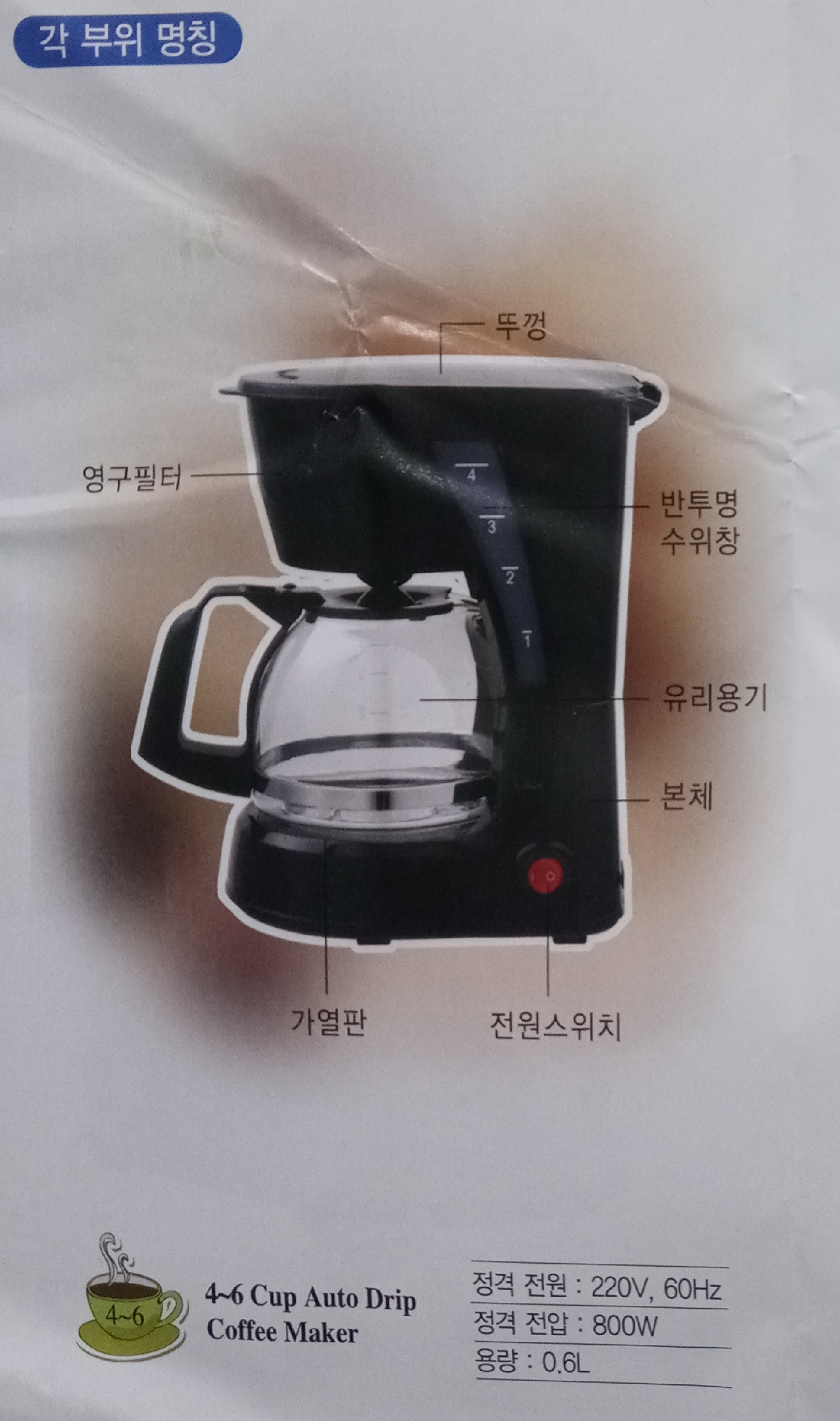 - 기능 : 반투명 수위게이지, 온도유지열판, 반영구적 필터, 분리형 필터홀더, 누수방지 장치