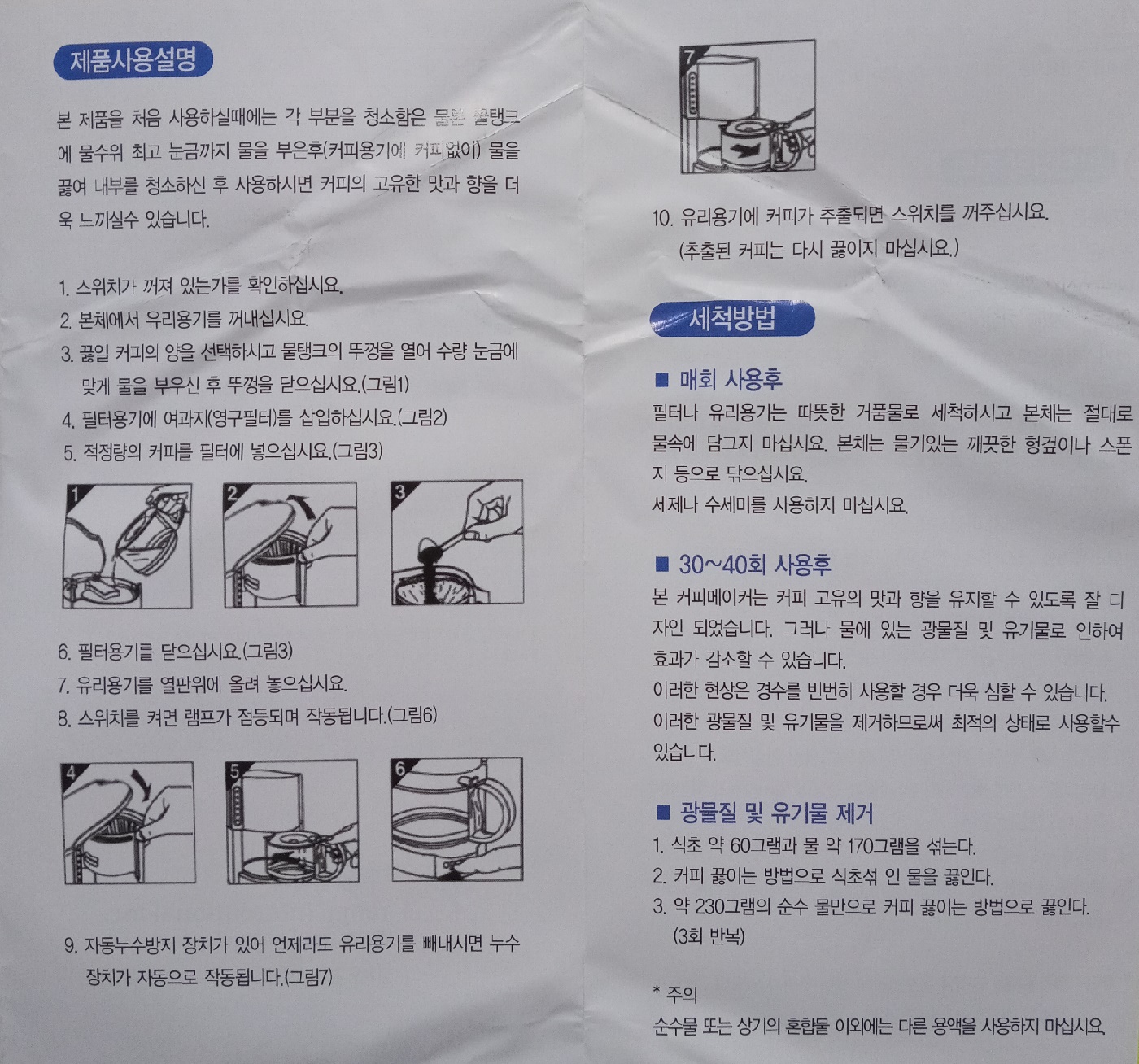 - 필터나 유리용기는 따뜻한 거품물로 세척하고 본체는 절대로 물속에 담그면 안된다. 본체는 물기있는 깨끗한 헝겊이나 스폰지 등으로 닦는다. 세제나 수세미를 사용하면 안된다.