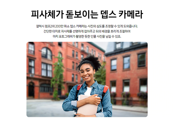갤럭시 점프2의 200만 화소 뎁스 카메라는 사진의 심도를 조정할 수 있게 도와준다. 간단한 터치로 피사체를 선명하게 잡아주고 뒤의 배경을 흐리게 조절하여 포토그래퍼가 촬영한 듯한 인물 사진을 남길 수 있다.