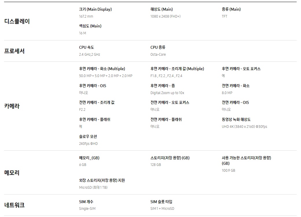- 후면카메라(쿼드 렌즈) : 4,800만 화소(메인), 500만 화소(초광각), 200만 화소(접사), 200만 화소(뎁스)
