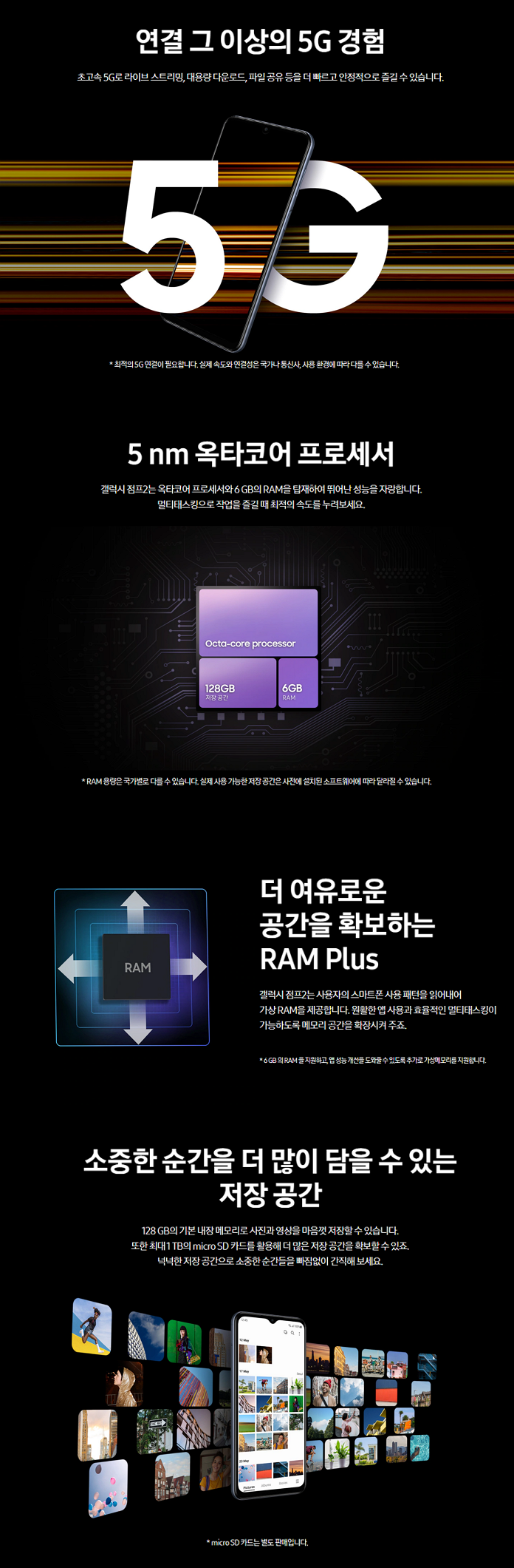 - 외장 스토리지(저장 용량) 지원 : MicroSD (최대 1 TB)