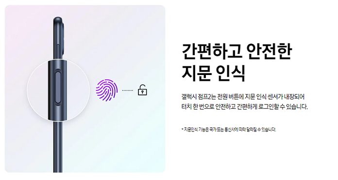 - 갤럭시 점프2는 전원 버튼에 지문 인식 센서가 내장되어 터치 한 번으로 안전하고 간편하게 로그인할 수 있다.