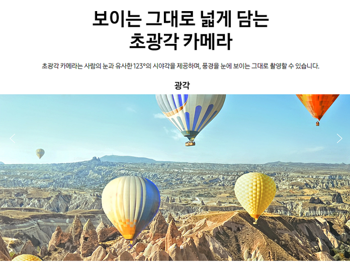 초광각 카메라는 사람의 눈과 유사한 123˚의 시야각을 제공하며, 풍경을 눈에 보이는 그대로 촬영할 수 있다.