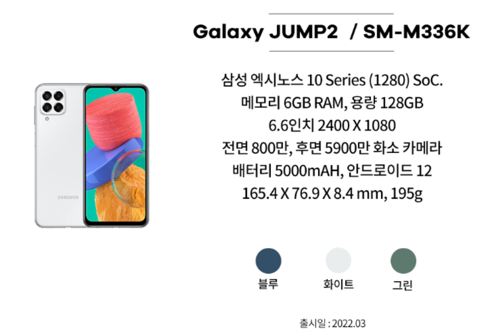 스마트폰 삼성 갤럭시 점프2 5G(SM-M336K, 2022) 스펙, 디자인, 기능, 사용설명서 정리