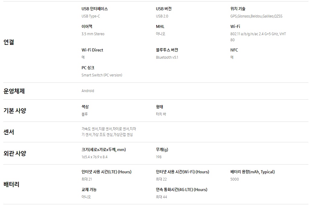 - 연결단자 : 나노유심 / USB Type-C