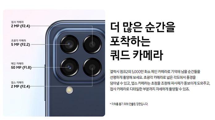 - 후면 카메라(쿼드 렌즈) : 50MP(메인), 8MP(초광각), 2MP(접사), 2MP(뎁스)