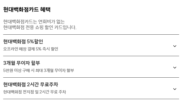 현대백화점카드는 연회비 없는 현대백화점 전용 쇼핑 할인 카드이다. 현대백화점 5% 할인, 3개월 무이자 할부, 현대백화점 2시간 무료주차 등의 혜택이 제공되고, 현대백화점, 현대아울렛, 더현대닷컴, 현대식품관 투홈에서 사용이 가능하다.