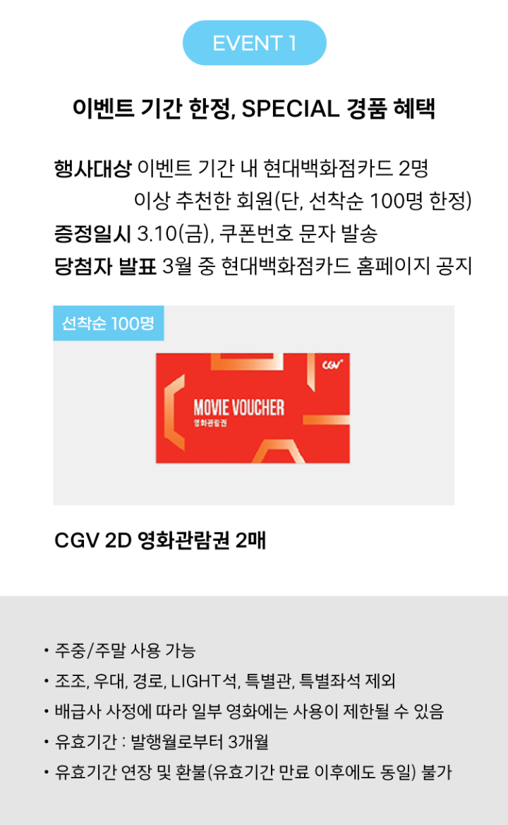 - 이벤트 기간 내 2건 이상 추천한 인원 중 선착순 100명에게 CGV 2D 영화관람권 2매 지급!