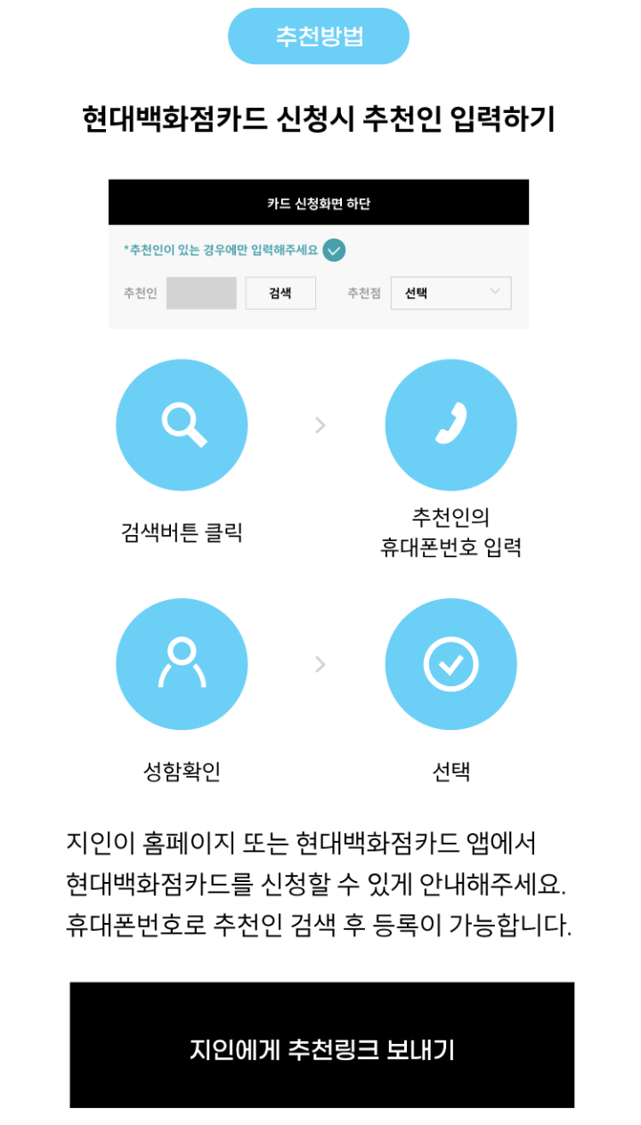현재 현대백화점카드 친구 초대 이벤트가 진행 중인데, 신규가입자에게는 현대백화점 상품권 1만원이 지급된다. 친구추천에도 참여가능한데, 추천 링크를 복사해서 지인에게 전달하고, 지인이 해당 링크로 신규가입하면 자동 참여된다.