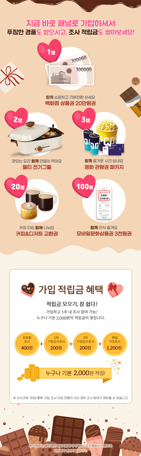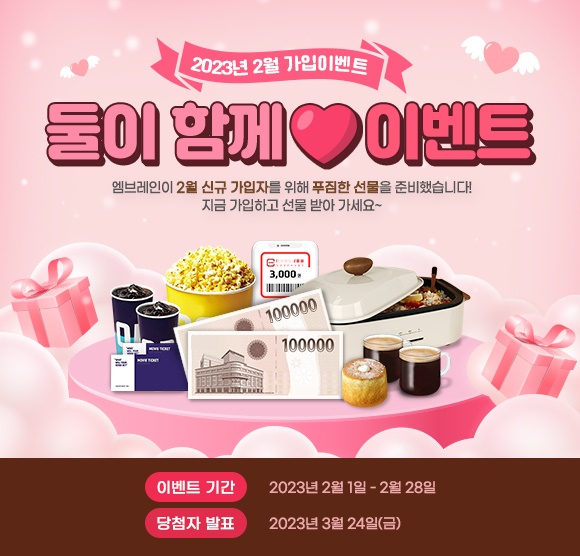 2023년 2월 이벤트 선물은 백화점 상품권 20만원권(1명), 멀티 전기그릴(2명), 영화 관람권 패키지(3명), 커피&디저트 교환권(20명), 모바일문화상품권 3천원권(100명) 이다. 엠브레인 패널파워 가입하여 포인트도 적립하고 다양한 이벤트에도 응모해보자.
