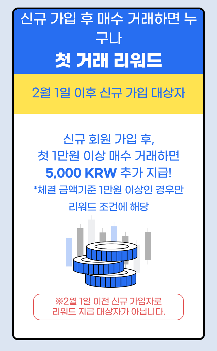 -* 첫 거래 리워드 조건은 최초 거래 시 10,000 KRW 이상으로 체결된 주문인 경우에만 해당된다.