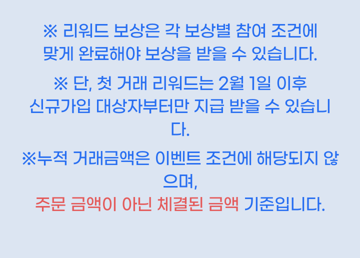 (누적 거래금액은 이벤트 조건에 해당되지 않으며, 주문 금액이 아닌 체결된 금액 기준.)