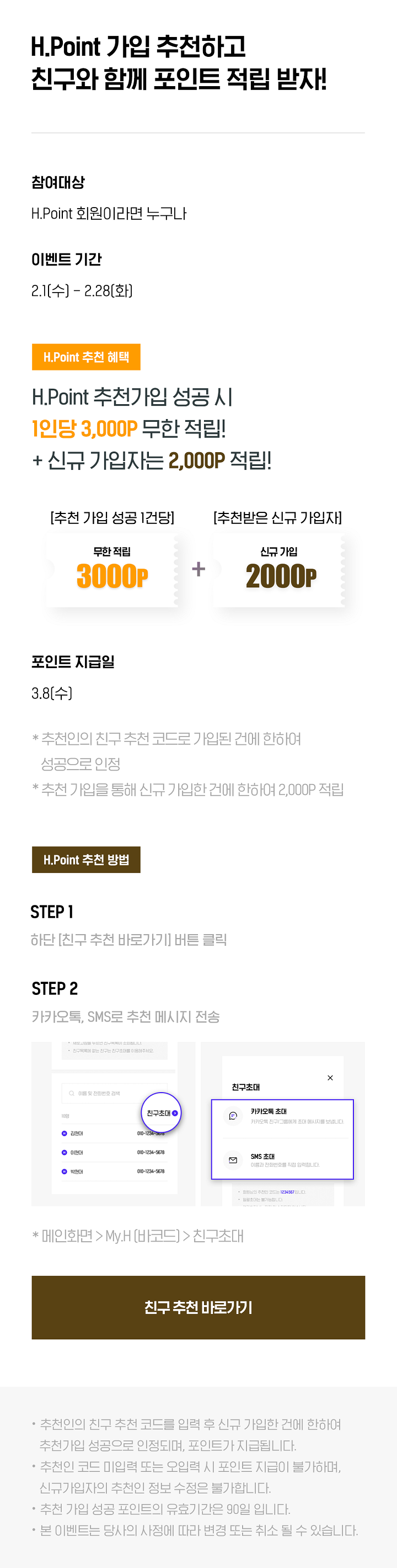 - H.Point 추천가입 성공 시 1인당 3000P 무한 적립! + 신규 가입자는 2000P 적립!