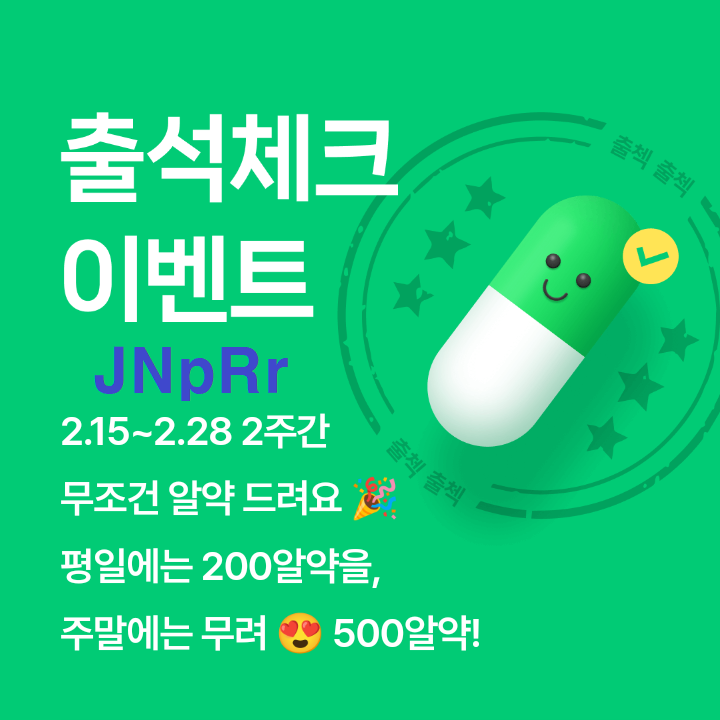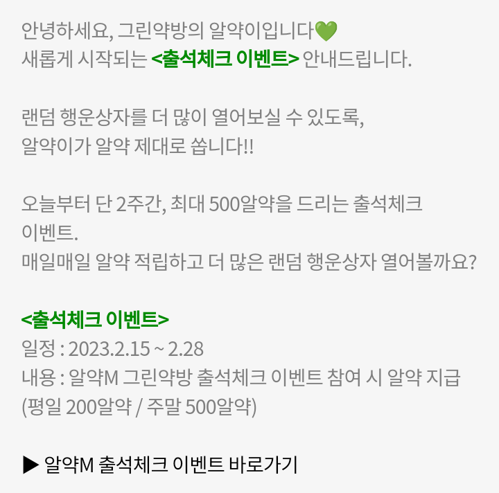 ▶ 내용 : 알약M 그린약방 출석체크 이벤트 참여 시 알약 지급(평일 200알약, 주말 500알약)